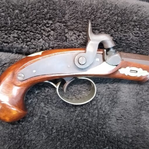 We’ve used all the best in parts for this fine piece: American black walnut stock, holding a polished steel Colerain 62 cal. swamped jaeger barrel with radius grooved rifling and signed by the artist. The sights are early Jaeger as well.
